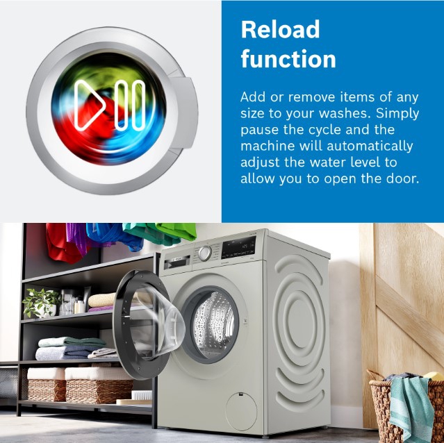Designed for usability, the LED display shows clear time countdowns and options. Select from a range of programmes, including Wool, Easy Care, Mixed Load, Sportswear and more. Adjust temperature and spin speed to suit your fabrics. With the Reload function, you can add forgotten items mid-cycle. Its illuminated interior drum, continuous delay timer, and child lock add extra convenience and safety to your wash day routine.
