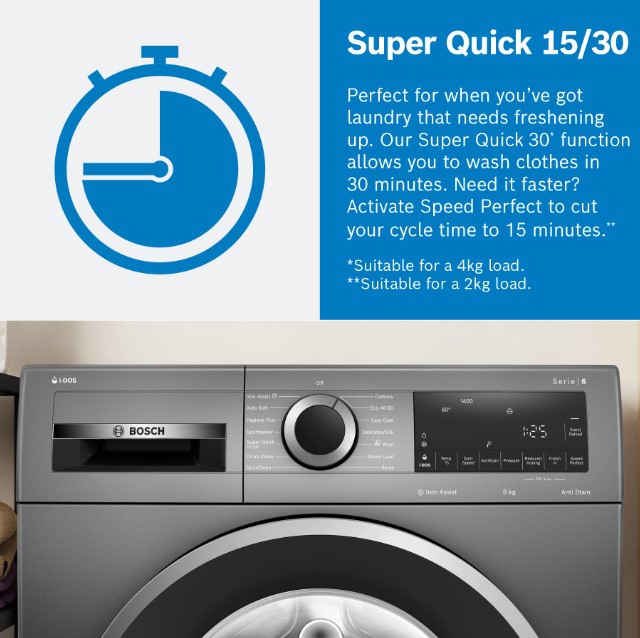 If you're often short on time, the SpeedPerfect option is a game changer. It reduces wash times by up to 65%* while maintaining thorough cleaning results. Whether it’s a last-minute school uniform or sports kit, the WGG244ZCGB provides dependable performance under pressure. When paired with the Mixed Load programme, up to 4kg of laundry can be washed in under an hour—making everyday laundry far less stressful.