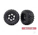 Belted Sledgehammer tyres deliver game-changing stability and control whether youre slinging mud or setting speed records. The wide, open-block tread design wont clog up with dirt or debris and the lightweight belting maintains the tyres shape for a larger contact patch, more grip, and responsive handling at any speed. At 8.4" tall, the Sledgehammers increased diameter gives your X-Maxx a more powerful stance with even higher ground clearance. Sledgehammer tyres come pre-mounted to massive 6-spoke black X-Maxx wheels with an ultra-tough 8s-rated glue bead for the most extreme high-speed off-road action. Fits 24 mm splined hex, front or rear.