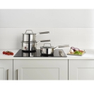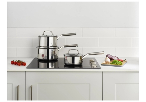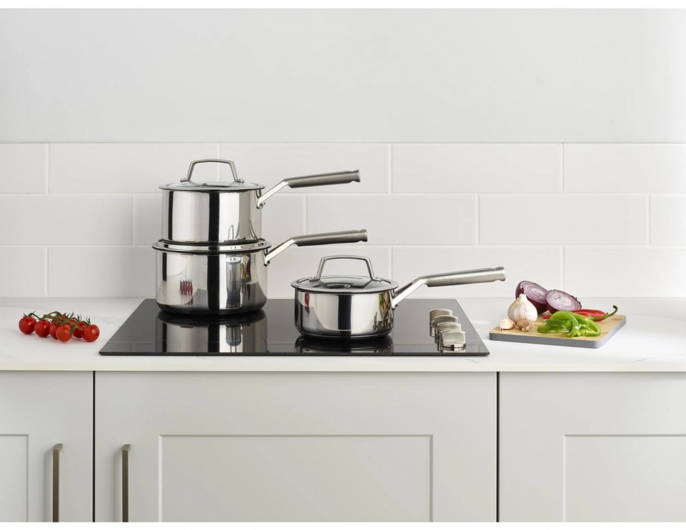 - Three versatile sizes – 16cm, 18cm, and 20cm saucepans with tempered glass lids