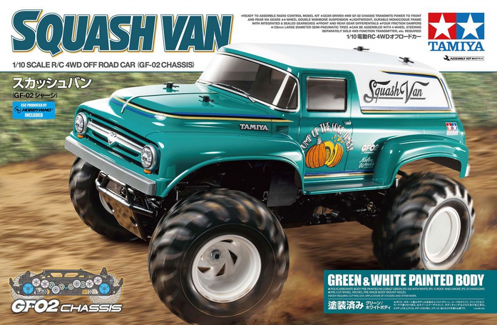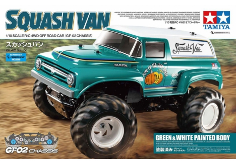 - Product Type: Tamiya Squash Van GF-02 1/10 RC Kit, Tamiya 4WD Off-Road Van, Tamiya 1/10 Squash Van Green White Pre-Painted Body, Tamiya 4WD RC with gear-driven GF-02 chassis, Tamiya RC van with friction dampers and large lug tyres