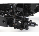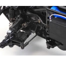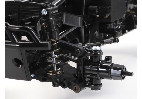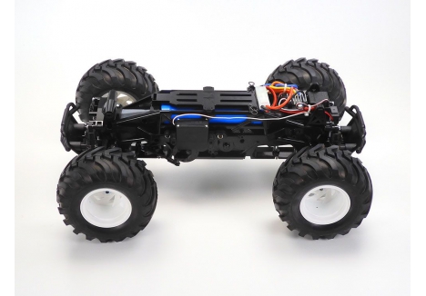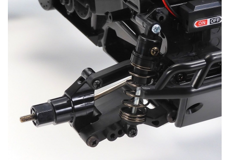 Unlike the comical GF-01 chassis, the Tamiya 4WD RC with gear-driven GF-02 chassis features a more realistic wheelbase and a slim monocoque frame with ladder and pipe motifs. The motor is positioned low and centrally to enhance balance, while the integrated sealed gearboxes keep the drivetrain protected. The front and rear gear differentials allow smooth cornering, and the double wishbone suspension with friction dampers absorbs shocks effectively. The chassis also supports four-wheel steering when paired with a compatible third-party radio system, offering advanced control options.