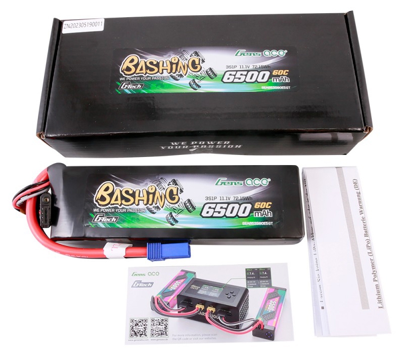 Gens ace G-Tech 6500mAh 11.1V 60C 3S1P Lipo Battery packs are suited for 1/8 SLEDGE, 1:7 FELONY 6S BLX/LIMITLESS/INFRACTION 6S BLX/MOJAVE 6S/Kraton Roller/MOJAVE ROLLER;1:8 TYPHON 6S/3S, KRATON 6S BLX/TALION 6S BLX/OUTCAST 6S BLX/NOTORIOUS 6S;1:10BIGROCK 4x4 3S BLX/OUTCAST/Kraton