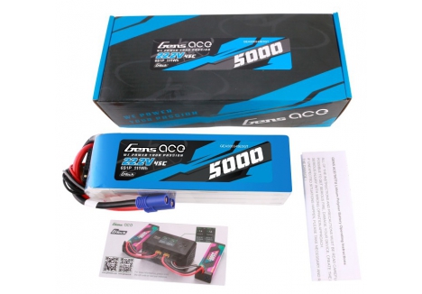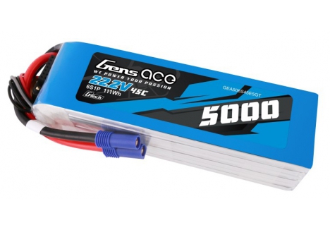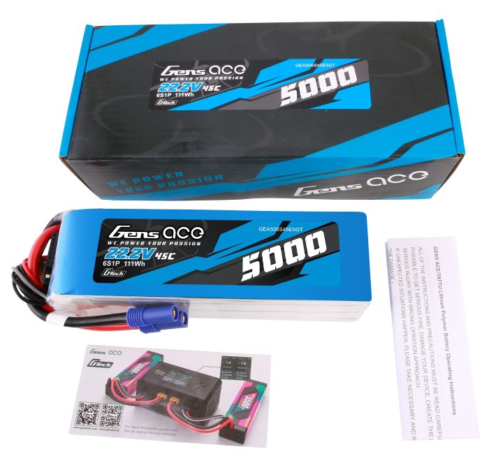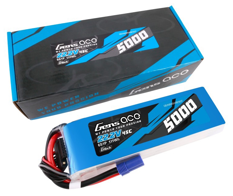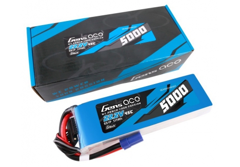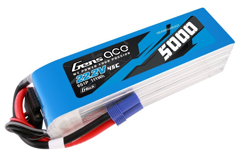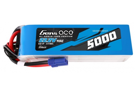 Gens ace G-Tech 5000mAh 22.2V 45C 6S1P Lipo Battery Pack with EC5 Plug is designed for best heli pilots, well used in all the big heli event,the true 45c rate, can provide the power all the helis needed, support all the difficult 3D movings and fastest speed, it can also be used in big scale RC aircraft and RC boat, smooth power and stable, make your flight exciting and power, long cycle life ensured quality.