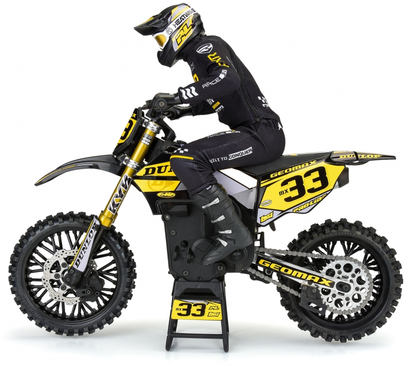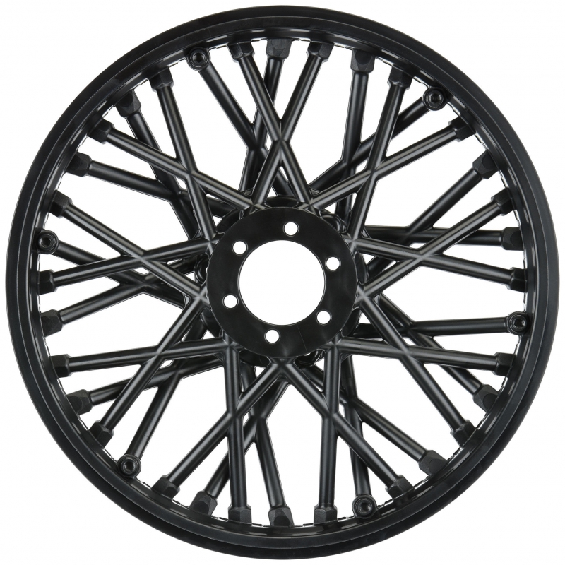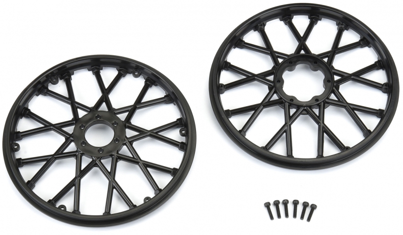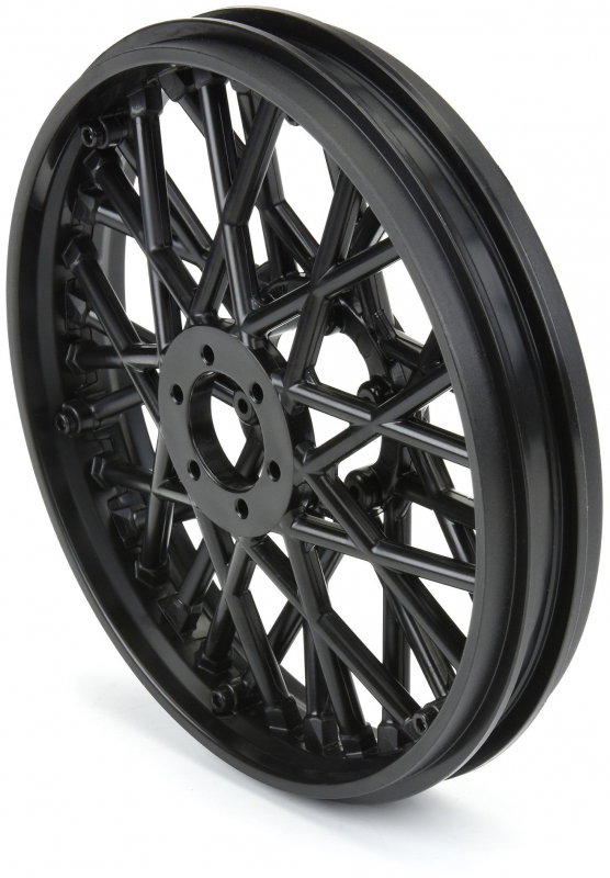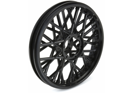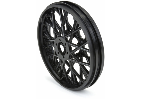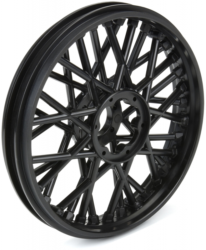 The Bullyspoke wheel features thicker spokes than stock wheels to prevent bending on hard impacts. It utilizes Pro-Line's V2 Bead style, which has benefits in both ease of use and aesthetics. The wide, flat 1/8 buggy-style glue mounting bead makes tire gluing a cinch. The beads overall have been brought in towards the center of the wheel, which creates a much more scale-looking tire profile that matches your real dirt bike. Pair this with Pro-Line MX33 tires (PRO1022901) for the ultimate upgrade in style and performance! These wheels are molded from high-quality black nylon right here in the USA.