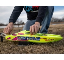 The Pro Boat B-PRB08049T1 Blackjack 24 inch V2 RTR with 2200Kv brushless motor and 90A Smart ESC is a race-ready catamaran engineered for blistering speed, rugged durability, and effortless battery swaps. Inspired by full-scale offshore racers, this Heat Wave edition features a bold chartreuse livery and delivers 45+ MPH performance straight out of the box. Powered by a Spektrum Firma 2200Kv brushless motor and paired with a 90A Smart ESC, the Blackjack 24 inch V2 is 4S-capable and telemetry-ready for advanced users. Its composite hull houses a clean interior layout, dual IC5 connectors, and a water-resistant receiver box to keep electronics safe and secure. With adjustable aluminum hardware, a breakaway rudder, and the innovative SSL battery tray, this catamaran is built for aggressive lake racing and fast turnaround between runs.