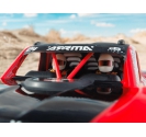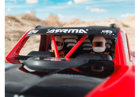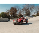 The red desert truck body of the ARRMA MOJAVE GROM C-ARA2104T1 features a clipless quick-release mechanism that simplifies access to internal components. With no small clips to fumble with, users can remove or reattach the body with a single press-and-release motion. This system is especially useful for younger drivers or those who want fast battery swaps and maintenance. The body itself is styled with Baja-inspired details and colour-matched wheels, giving the MOJAVE GROM a bold, authentic look that matches its performance.