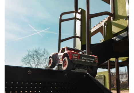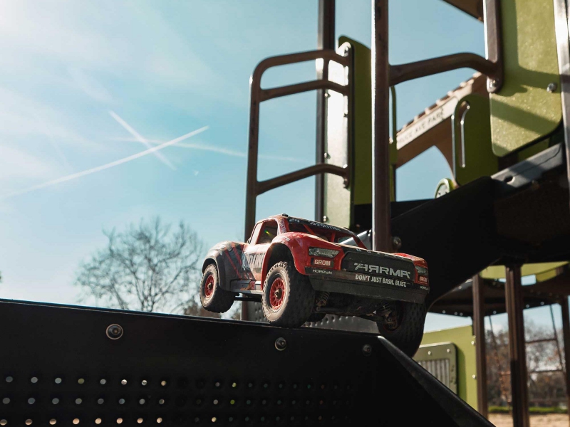 The ARRMA MOJAVE GROM C-ARA2104T1 is purpose-built for aggressive driving in tight spaces. Its compact 1/16 scale size allows it to tackle terrain that larger RC trucks can’t reach, while retaining the same engineering standards found in ARRMA’s full-size vehicles. The ventilated composite chassis houses a high-speed cooling fan and motor heatsink to maintain optimal performance. Oil-filled coil-over shocks absorb impacts and maintain stability over jumps and bumps. Whether you’re bashing indoors or outside, this desert truck is ready to take punishment and keep going.
