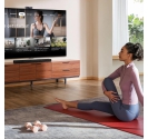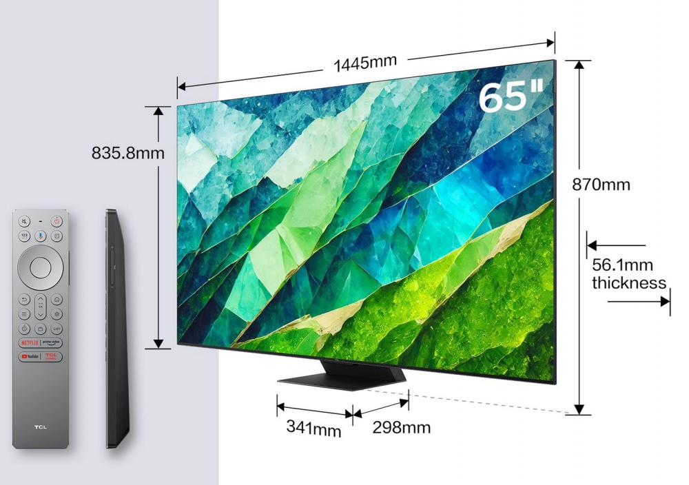 The C855K features a bezel-less slim metal design that complements any modern interior. The central stand offers stability and style, while the VESA mount compatibility (40 x 30 cm) allows for easy wall installation. With a depth of just 1.4–5.6 cm without the stand, the profile is sleek and unobtrusive.