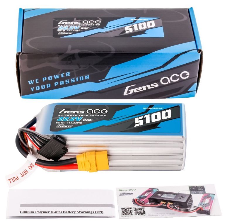 For heli enthusiasts looking to maximize flight time, voltage stability, and smart charging efficiency in 700 class brushless platforms, the Gens Ace O-GT6S5100-80X9 G-Tech 6S 5100mAh 80C LiPo battery with XT90 connector is the affordable Gens Ace 5100mAh 6S battery with XT90 connector and long cycle life. Buy Gens Ace O-GT6S5100-80X9 battery for 700 class brushless heli platforms.
