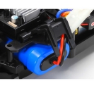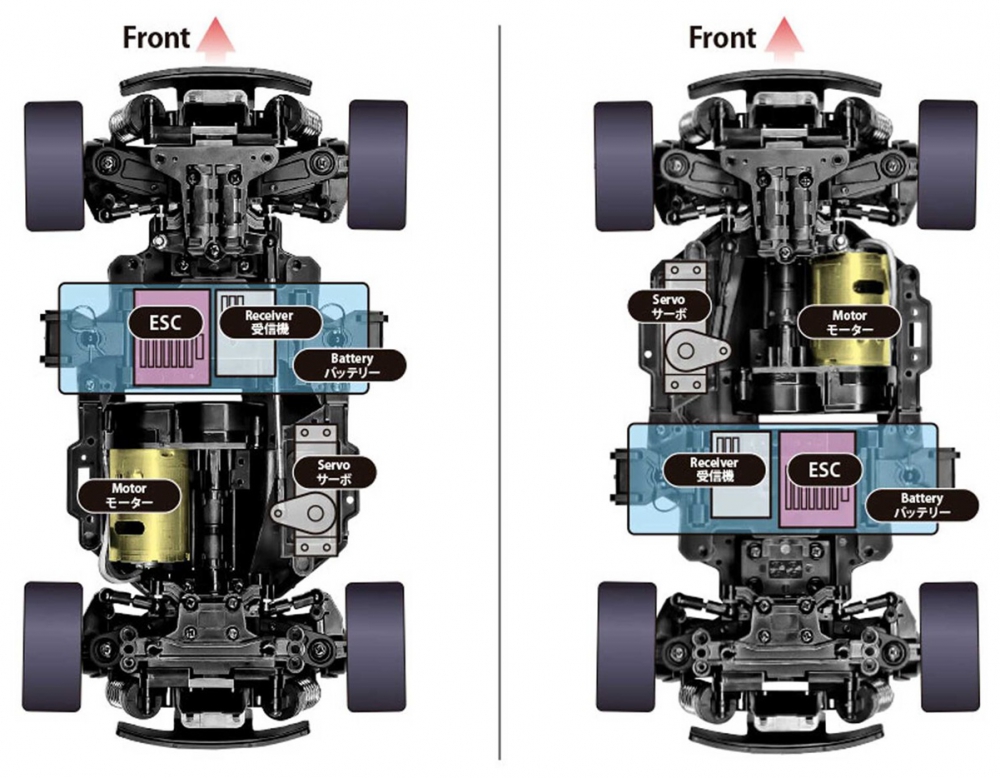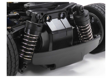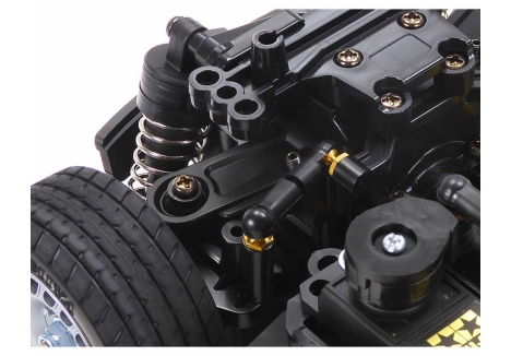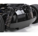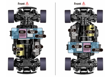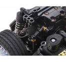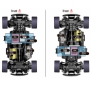 The compact, 2WD MB-01 chassis gives a choice of three types of wheelbases, and front- or rear- wheel drive system. This model employs a midship motor, rear-wheel drive setup. Without removing battery pack, motor, and R/C equipment setups from the centre frame, simply change attachment directions of final gears and steering linkage to switch between front- and rear-wheel drive; low or high motor position can be chosen for rear-wheel drive cars. The 4-wheel double wishbone suspension features symmetrical structure and friction dampers. Unitized sections such as motor mount, final gears and suspension facilitate ease of assembly and effective maintenance.