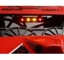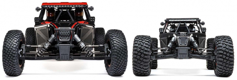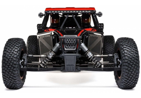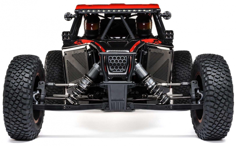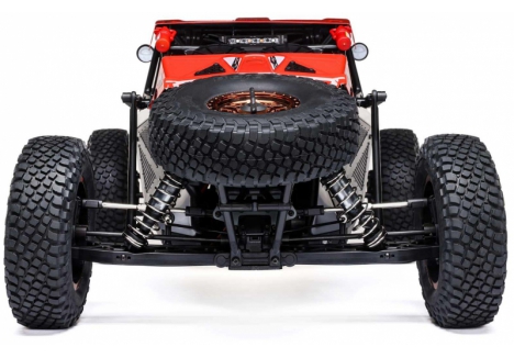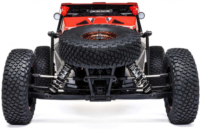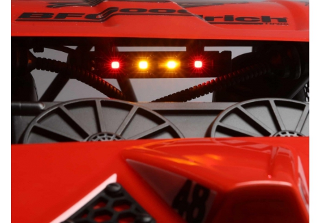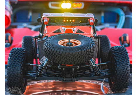 The Losi off-road RC car with adjustable suspension and functional spare tyre is packed with authentic features that replicate the look and feel of a full-size Ultra4 racer. From the molded fire extinguishers and air hoses to the window nets and driver figures, every detail is carefully crafted. The flip-top cage allows quick access to internal components, while the fully functional spare tyre is mounted with a scale wheel nut for real-world utility. Officially licensed BFGoodrich KR3 tyres and Raceline Ryno wheels provide both performance and visual impact. The LED lighting system includes amber pods, a bright front light bar, and a multi-colour rear tail light, enabling night-time operation with full visibility. These features make the Losi C-LOS04019 brushless desert buggy one of the most immersive and realistic large-scale RC vehicles available.