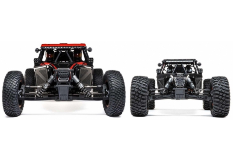 The Losi desert buggy with full-metal drivetrain and LED light system is engineered to withstand the rigours of off-road racing. Every driveline component—from the axles to the ring and pinion gears—is constructed from heat-treated steel. The centre spur gear is also metal, ensuring long-term reliability under high torque loads. The drivetrain includes three sealed oil-filled differentials (front, centre, and rear), which distribute power efficiently and maintain traction across all four wheels. Combined with sway bars and adjustable steel turnbuckles, the drivetrain delivers consistent performance through corners, jumps, and uneven terrain. This robust construction allows the Losi C-LOS04019 4WD Super Lasernut buggy to thrive in demanding environments.