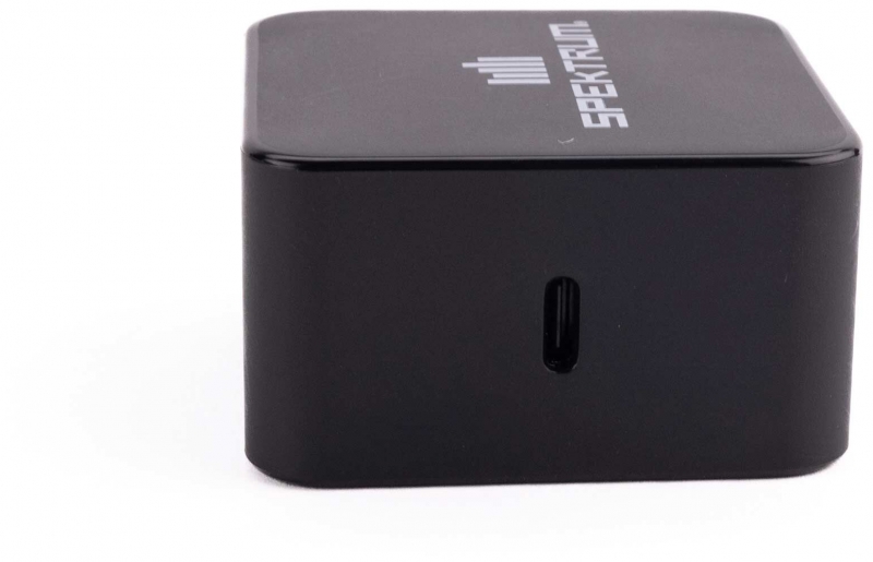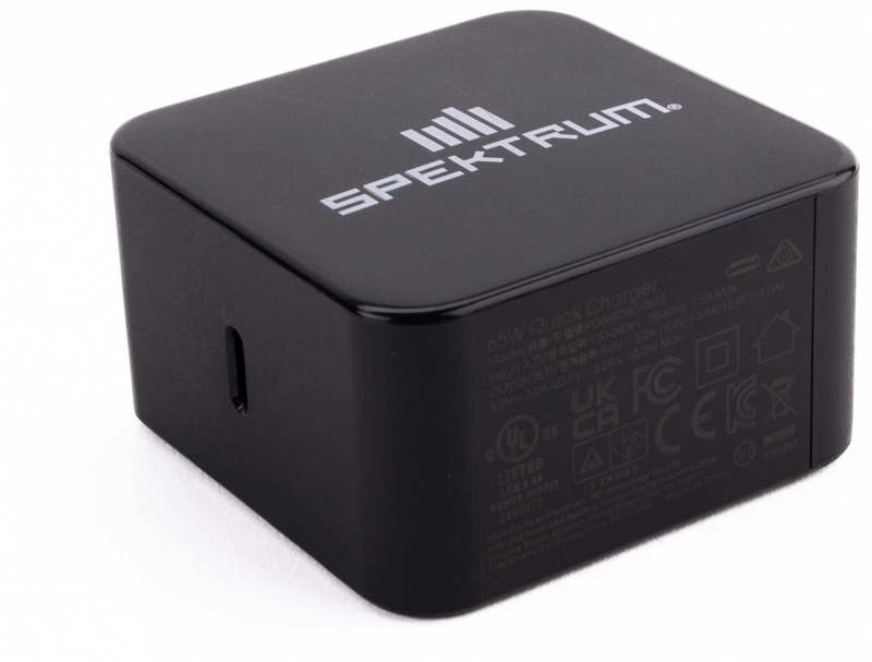 The SpektrumT 65W Power Block stands out from traditional USB-C converters with its ability to deliver higher power in such a small size. This compact device, powered by Gallium Nitride electronic components, is perfect for converting AC input power to USB-type DC output. Its foldable AC input terminals make it easy to store. It's an ideal companion for the Spektrum S100 1x100W USB-C Smart Charger (SPMXC2090).