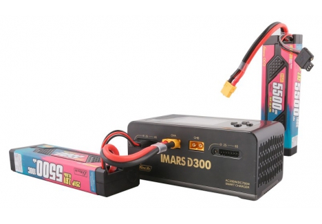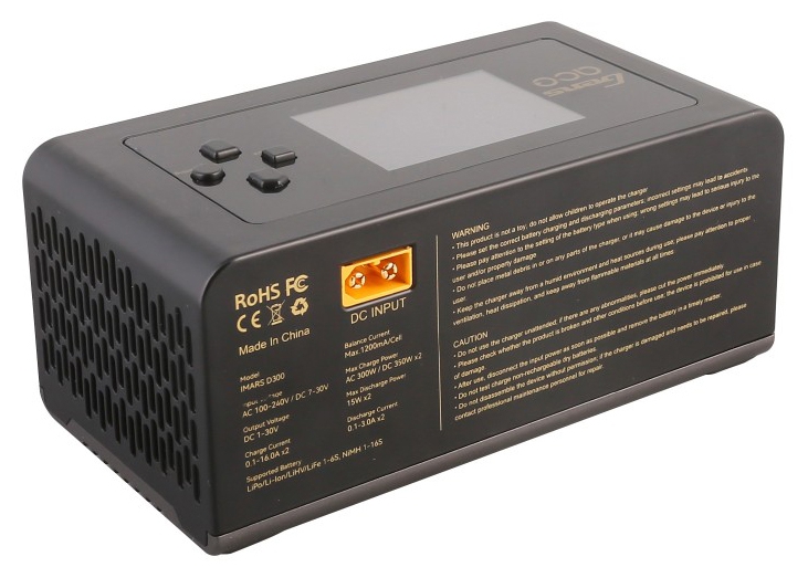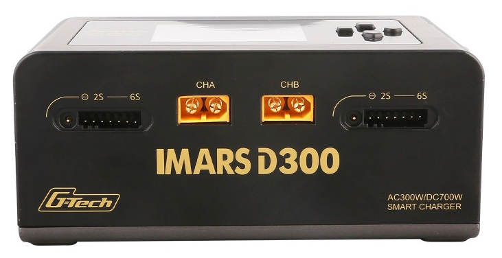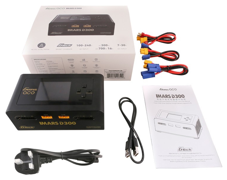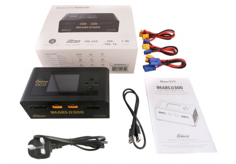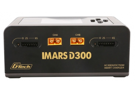 As a multi chemistry charger it gives you the flexibility to charge/balance charge 1S-6S/2S-6S lithium batteries (LiPo, Li-Ion, LiFe and LiHV) and 1S-16S NiMH meaning whatever your fly, sail, race or bash the D300 can ensure your charged and ready to go. With two individual channels you can independently charge/balance charge at a rate of up to 16A per channel with a maximum of 300W of power on AC or 350W of power on DC dependent on the power input. Beyond charging the D300 has an impressive level of extra functionality such as Discharge, Storage, DigitalPower, ExtDischarge and SyncCharging offering more versatility out of this small charging package. The Discharge function allows you to discharge batteries of multi chemistry types at variable rate of up to 3A per channel. If you are planning on leaving your batteries for a period of time it is best practice to store them with a level of charge in, this is easily done by selecting the 'Storage' function within the menu. The iMars D300 will then charger or discharge (depending on the condition of the battery) to a voltage that ensures your batteries will be in peak condition next time you go to use them. The SyncCharging function allows you to combine both charge outputs to give you a maximum charge rate of up to 23A by using a parallel charge cable (sold separately) ideal for stock racers looking to get optimum performance from their power source! DigitalPower mode allows the charger to be the equivalent of an adjustable power supply meaning you can use the charger to power items such as soldering iron or tyre warmers! Finally the ExtDischarge function allows you to quickly discharge a battery source with an XT60 connector with an external discharge load such as Tyre warmers, Soldering Iron or LED Display.