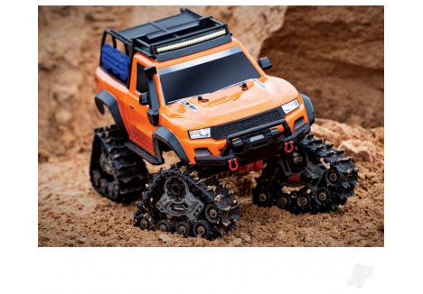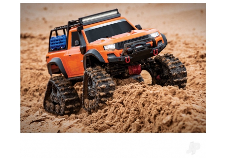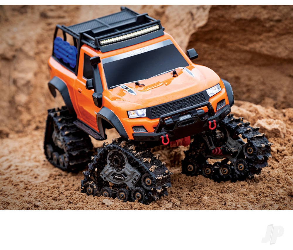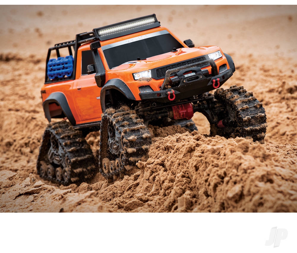 The Traxxas TRX82234-4-ORNG waterproof 4x4 RC crawler with LED kit is engineered for drivers who demand performance in unpredictable terrain. The Traxx system increases ground clearance and approach angles, allowing the crawler to straddle large obstacles and climb steep grades with ease. The oversized contact patch and aggressive tread design provide superior grip, making the Traxxas 4X4 RC trail truck for mud, rocks, and deep sand a top performer in environments where traditional wheels struggle. Whether navigating muddy riverbanks or loose desert sand, this crawler maintains traction and control.