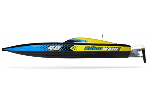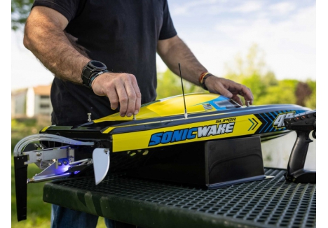The Pro Boat Super Sonicwake RC Boat is a black, 48-inch, large-scale deep-V powerhouse engineered for RC enthusiasts who demand uncompromising speed, control, and innovation. As the largest and most advanced model in the Pro Boat lineup, this Ready-To-Run brushless boat delivers a thrilling experience across expansive lakes and ponds. With a top speed exceeding 50 mph, the Super Sonicwake combines brute force with intelligent design, offering a self-righting hull, dual water-cooling systems, and Smart electronics for seamless performance. Whether you're chasing adrenaline or mastering precision, this RC boat is built to dominate.