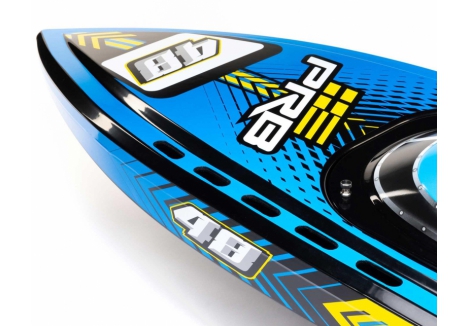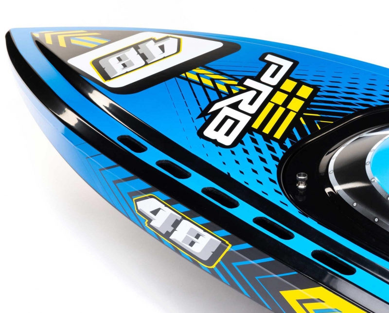 The Pro Boat Super Sonicwake 48 inch boat with ABS hull and offset rudder is constructed for resilience and control. The thick ABS material absorbs impact and resists wear, while the offset rudder design improves directional stability. These elements work together to deliver a smooth, predictable ride even at high speeds. The hull’s deep-V profile enhances hydrodynamics, allowing the boat to cut through water efficiently. This combination of materials and design ensures long-lasting performance in demanding conditions.