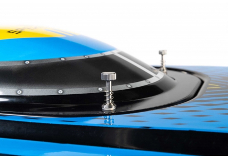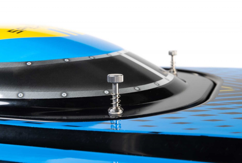The Pro Boat deep-V boat with breakaway rudder and quick canopy latches is designed for convenience and efficiency. The SSL (Strap, Slide, Lock) battery installation system allows users to swap power packs in seconds, minimising downtime and maximising water time. The canopy attaches using quarter-turn latches, providing fast access without the risk of stripping screws. These features make the Super Sonicwake easy to operate and maintain, even during intense sessions. The large-scale design is complemented by thoughtful engineering that prioritises user experience.