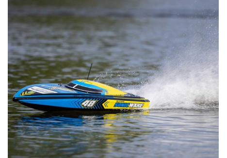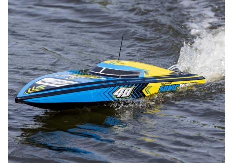 The Pro Boat Super Sonicwake RC boat for large lakes and high-speed bashing is built to thrive in expansive environments. With a length of 54.8 inches and a beam of 36.3 cm, this large-scale model offers stability and presence on open water. The thick ABS hull withstands rough conditions, while the offset rudder and flex shaft drive system provide responsive handling. Whether you're racing across flat water or launching off waves, the Super Sonicwake delivers the best combination of size, speed, and durability.