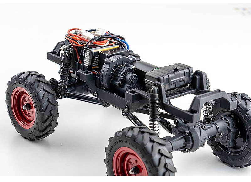 The remote-controlled lighting system in the FMS FCX24 Red V2 rock crawler with portal axles and lighting system adds a layer of realism and functionality. Headlights can be toggled between high and low beams, while reserved ports allow for future installation of taillights and turn signals. The 2.4GHz 4-channel digital proportional remote not only manages steering and throttle but also controls gear shifting via CH3 and leaves CH4 open for user-defined modifications. This open-ended design encourages hobbyists to personalize their crawler, making the FMS FCX24 Power Wagon Red V2 brushed 4WD scaler RTR a platform for creativity and performance upgrades.