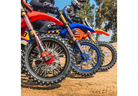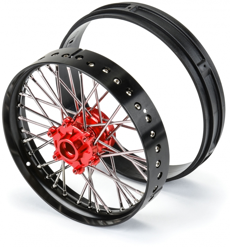 Just like full-size bikes, these wheels feature an anodized 6061 billet aluminum hub and rim with zinc-plated steel spokes that are factory-laced and precisely trued. Using the V2 Bead tire mounting sleeve, these wheels are easily mounted to your Pro-Line V2 Bead MX tires. The mounting sleeve provides a reliable glue bond to pre-mount tires and swap onto the Pro-Spec Aluminum Wheel.