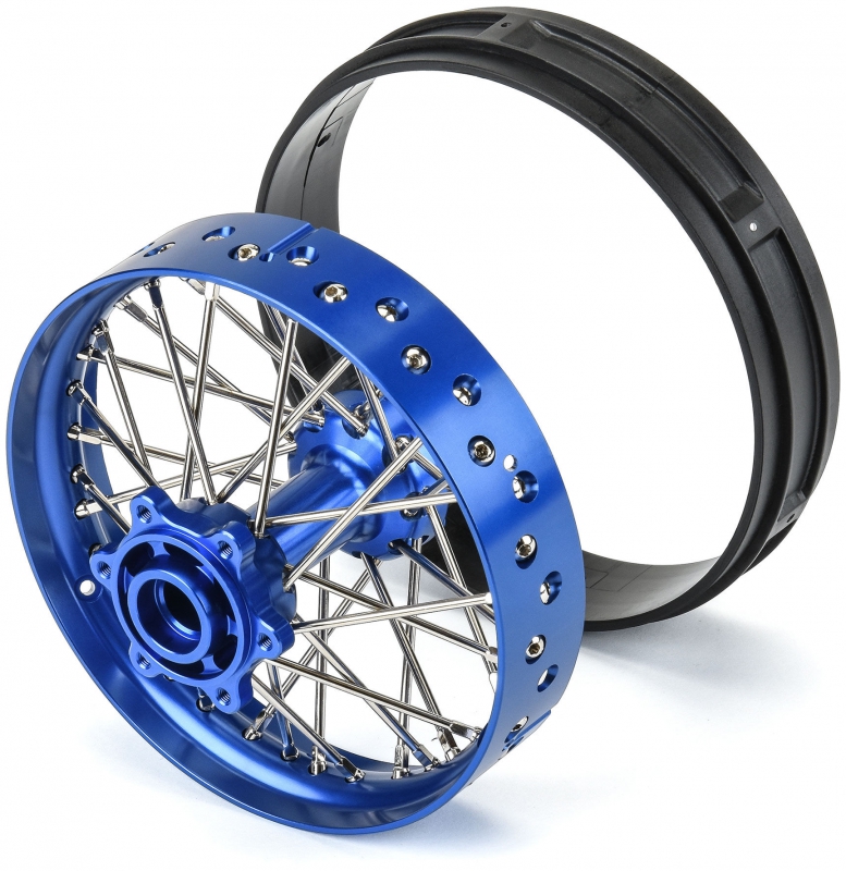 Just like full-size bikes, these wheels feature an anodized 6061 billet aluminum hub and rim with zinc-plated steel spokes that are factory-laced and precisely trued. Using the V2 Bead tire mounting sleeve, these wheels are easily mounted to your Pro-Line V2 Bead MX tires. The mounting sleeve provides a reliable glue bond to pre-mount tires and swap onto the Pro-Spec Aluminum Wheel.