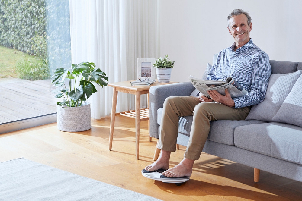Yes. Simply place your feet on the pads, use the remote control to select the intensity level, and relax. The cordless design and rechargeable battery allow you to use it comfortably in any room of your home. The auto-timer shuts off after 60 minutes, giving you a safe and worry-free session.