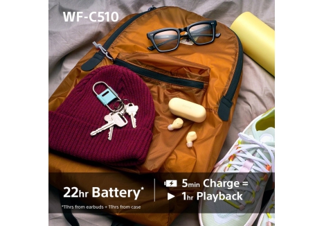 With up to 11 hours of continuous playback and an additional 11 hours from the charging case, the Sony headphones with 22 hour battery life WFC510L.CE7 offer uninterrupted listening throughout the day. Whether you're commuting, working, or relaxing, you won’t need to worry about frequent recharging. And when time is short, a quick 5-minute charge gives you an extra hour of playtime—perfect for last-minute top-ups before heading out.