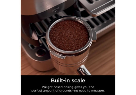 The Ninja espresso machine with integrated grinder and tamper streamlines the entire brewing process by combining grinding, dosing, and tamping into a single workflow. The conical burr grinder offers 25 grind settings, allowing users to fine-tune texture for espresso, filter coffee, or cold brew. The built-in scale ensures accurate dosing, while the assisted tamper applies consistent pressure with a simple lever push. This integration eliminates guesswork and ensures repeatable results, making the Ninja Luxe Café Pro Series with built-in grinder and steam wand an ideal choice for those who value consistency and control. The grinder also recognises which basket is inserted and auto-adjusts settings accordingly, enhancing usability and reducing setup time.