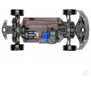 The modular low-CG chassis of the Traxxas Mustang RTR drift car for sale with high-angle steering and adjustable suspension positions weight low for improved handling and stability during high-speed drifts. Interlocking chassis pieces enhance rigidity and simplify maintenance, while the adjustable battery hold-down accommodates various battery sizes securely. The suspension system is fully tunable, with dual rear camber link mounts and adjustable droop, camber, toe, ackerman, track width, and roll center. These features allow drivers to fine-tune the setup for optimal drift performance and responsiveness.