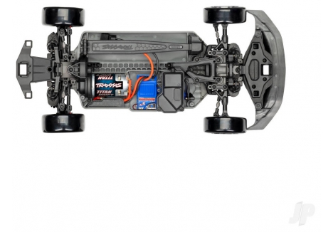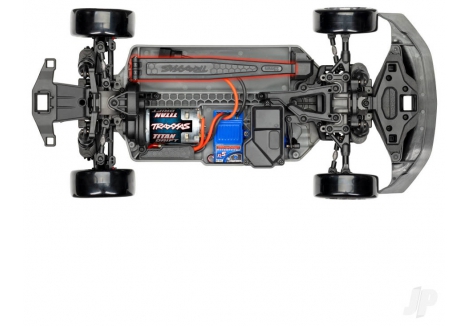 The Titan Drift 21T brushed motor in the Traxxas Ford Mustang 4-Tec with XL-5 ESC and Titan Drift motor delivers high-torque output with virtually maintenance-free operation. Its internal cooling fan supports extended run times, while the fixed gear mesh motor plate and molded wire retainer ensure secure installation. The waterproof XL-5 ESC complements the motor with three drive profiles—Sport, Race, and Training Mode—allowing users to tailor the car’s behavior to their preferences. EZ-Set one-button setup simplifies configuration, making the electronics package both powerful and user-friendly.