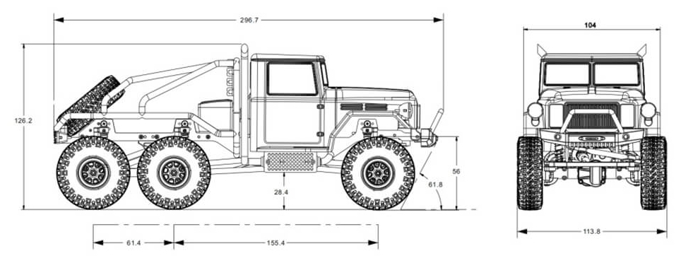 - Transmission Ratio: Final drive ratio of 104:1 – delivers high torque for slow, controlled crawling