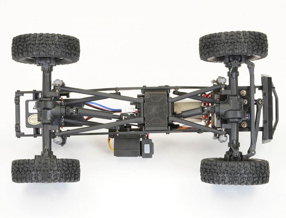 Small scale doesn’t mean less features and the EVO is no exception, boasting a servo operated 2-speed transmission for high and low speed crawling. A new final drive ratio provides the EVO with super slow crawling performance coupled with a new 130 size 100T motor for maximum torque. Switch to second gear for more straight-line speed when on flat ground. Full internal metal gears mean you can consider a future larger motor size upgrade, such as 180, 240 or 270 without losing sleep. The transmissions reverse rotation of the rear driveshaft also helps to minimise chassis torque twist.