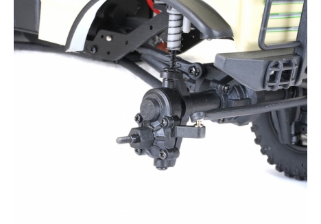 Front and rear portal axles on the FTX FTX5485GY Texan trail truck with aluminium chassis and LED light system elevate the axle housing above the wheel centreline, significantly increasing ground clearance. This design allows the FTX Outback Mini XP Texan with 130 brushed motor and panhard bar steering FTX5485GY to traverse rocks, roots, and uneven surfaces without snagging or bottoming out. The portal configuration also contributes to reduced torque twist, thanks to the reverse rotation of the rear driveshaft. Combined with the low centre of gravity and forward-biased weight distribution, the portal axles make the FTX 1/18 Texan crawler with water-resistant electronics and bead lock wheels FTX5485GY a formidable performer in tight, technical trail conditions.