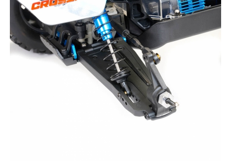A ballraced, sealed drivetrain with slipper unit along with metal diff gears with front universal driveshafts are ready to take care of the power when you hit the gas. New, sturdy front and rear towers with a full-length brace bar provide extra rigidity, while the heavy-duty rear spoiler maintains traction and stability at speed. Topping things off is the Crossbow’s aggressively styled, low slung bodyshell complete with roof light bar, roof skid rails and mounting point reinforcement plates.