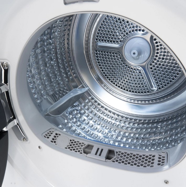 - Drying System: Heat Pump – A closed-loop system that recycles hot air for energy efficient tumble dryer performance