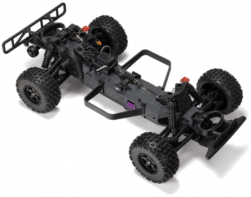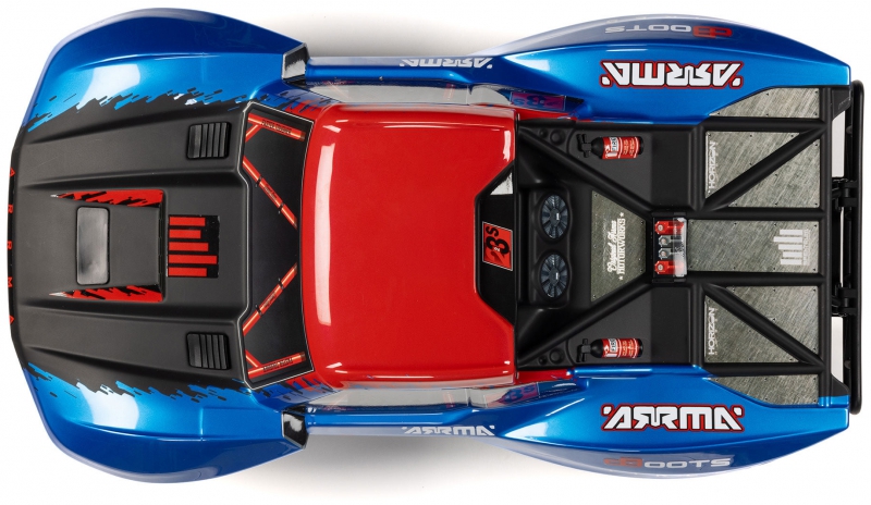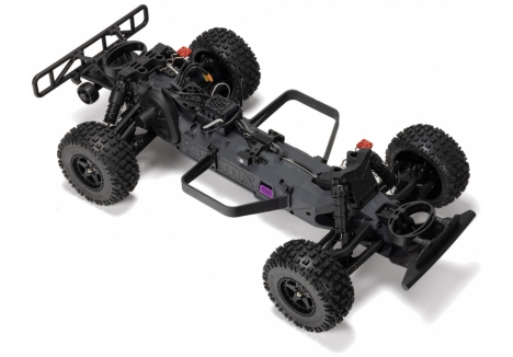 The ARRMA short course truck with composite chassis and dBoots Fortress SC tires is built for performance across a variety of surfaces. The aggressive tread pattern delivers excellent grip on dirt, gravel, and pavement, while the composite chassis resists impact and sheds debris. The hidden body retention system keeps the body secure during racing, and the bottom-loading battery tray allows quick swaps without removing the shell. Whether you're a beginner or an experienced driver, this SCT offers the perfect balance of size, speed, and strength.