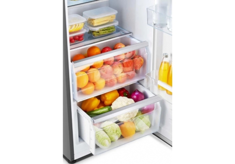 Equipped with five sturdy glass shelves, the Teknix 370L brushed steel fridge offers customisable storage for tall bottles, deli trays, and meal-prep containers. Two humidity-controlled crisper drawers preserve fruits and vegetables at optimal moisture levels, locking in freshness and nutrients longer than conventional systems.