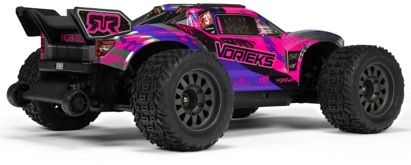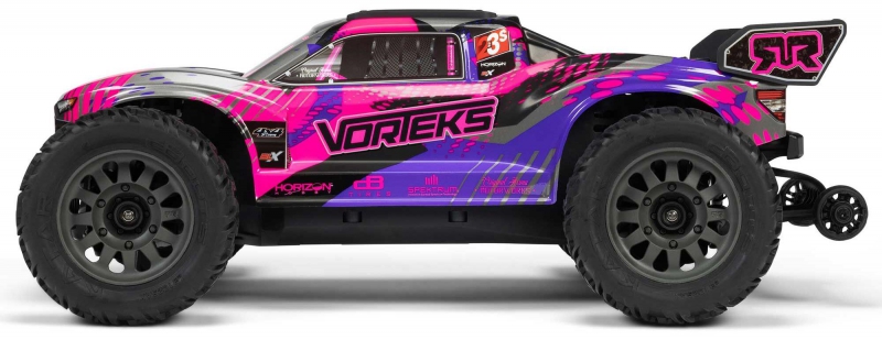 The ARRMA C-ARA4305V4T3 VORTEKS 223S BLX 4X4 RTR with 3100Kv brushless motor and 80A ESC is a purple 1/10 scale stadium truck engineered for drivers who want to transition from brushless beginner to high-speed bashing expert—without the need for upgrades or replacements. Designed for off-road agility and on-road precision, the ARRMA C-ARA4305V4T3 VORTEKS 223S BLX combines a wide stance, aerodynamic body, and race-tuned electronics to deliver scalable performance across 2S and 3S LiPo setups. With waterproof components, a center differential, and a hidden clipless body system, this stadium truck is built to handle terrain transitions, directional changes, and high-speed launches with confidence and control.