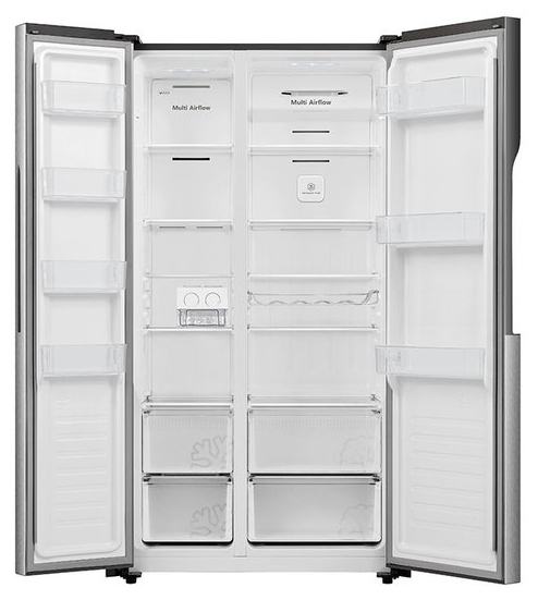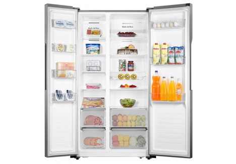 The Teknix side-by-side fridge freezer with mark-proof finish and adjustable feet is designed with user convenience in mind. The stainless steel exterior is treated with a mark-proof coating that resists fingerprints and smudges, keeping the appliance looking clean with minimal effort. Inside, the glass shelves offer a hygienic and easy-to-clean surface for storing food, while adjustable feet ensure stable installation even on uneven flooring. These thoughtful design elements make the fridge freezer a practical choice for households that value both aesthetics and functionality.