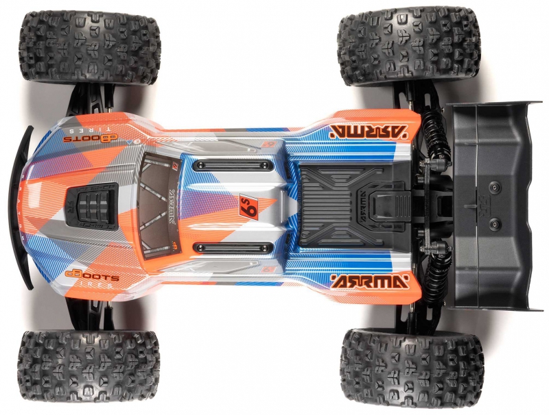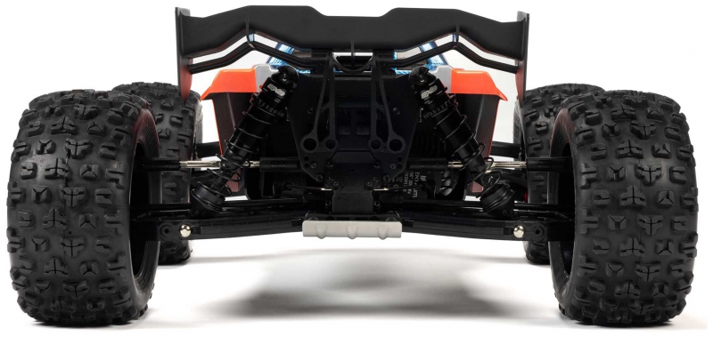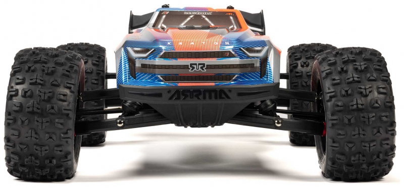 The ARRMA RC car with clipless body and SLT3 transmitter features a quick-release body retention system that eliminates traditional body clips. This design streamlines access to internal components for battery swaps and maintenance, while also adding structural protection against punch-through during crashes. The iconic KRATON body, finished in a bold orange multi-color scheme, complements the truck’s aggressive stance and includes a high-downforce wing mounted on an EXB-reinforced bracket. This combination of form and function ensures the ARRMA C-ARA8608V6T1 brushless monster truck looks bold and performs with practical efficiency, especially during frequent stunt sessions.