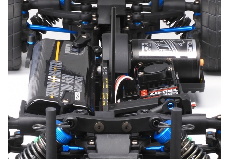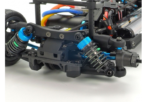 - Tamiya Super Short Big Bore dampers laid down to lower center of gravity and offer adjustable damping rates