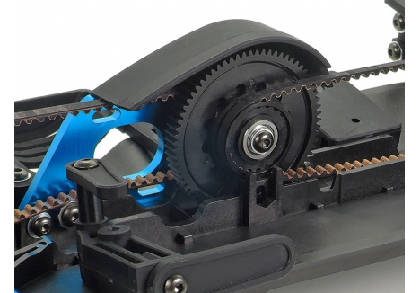 - Tamiya belt-driven 4WD RC kit employs dual belts to power front and rear oil-filled gear differentials