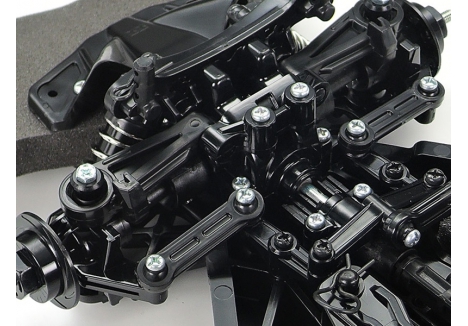 The shaft-driven 4WD TT-02 chassis employs a longitudinal layout with the battery on the left and the motor on the right, to give excellent stability. In addition, it features identical left and right suspension arms and uprights for ease of assembly, plus easy-to-maintain gearboxes. It is a highly adaptable chassis, as it offers 2 different wheelbases, 2 ground clearance settings and 2 tread set-ups in addition to a range of 10 possible gear ratios. It is not short on looks either, with brake disc-shaped wheel hubs and stylish front bumper supports.