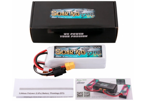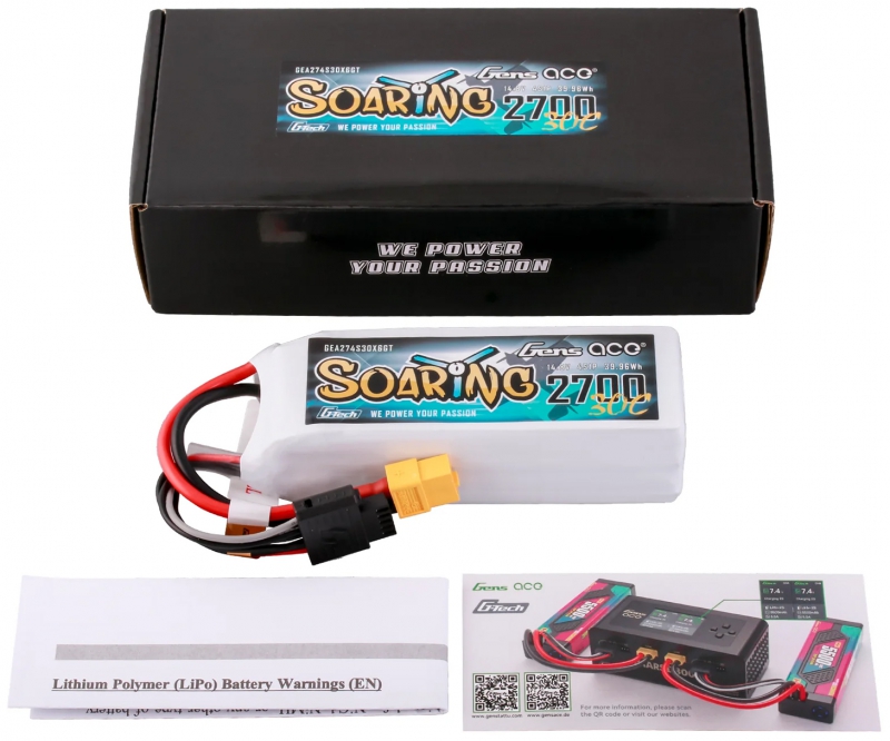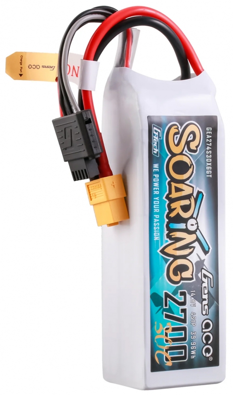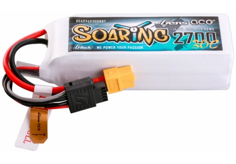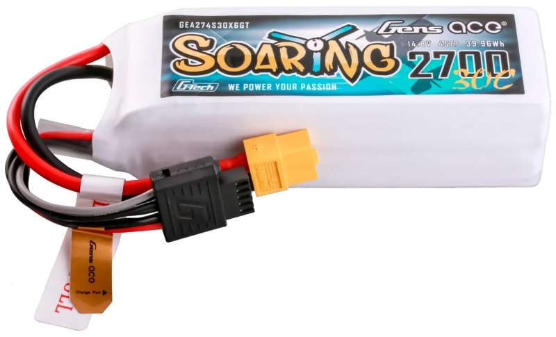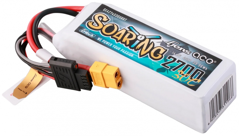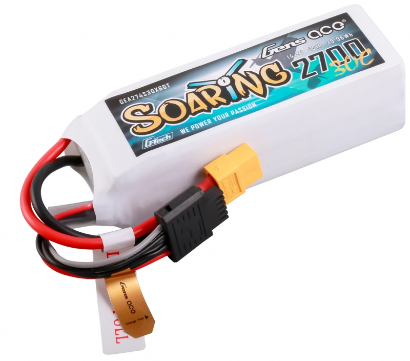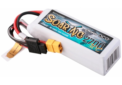 Gens ace G-Tech Soaring 2700mAh 14.8V 30C 4S1P LiPo Battery Pack originally designed and produced for DJI Phantom 1; with upgraded capacity; extend the flight time in the sky; it can be also use in small size of RC aircraft and RC heli; similar to 2200mah 3s but with 500mah more capacity; can also be fit in some RC crawler as well.