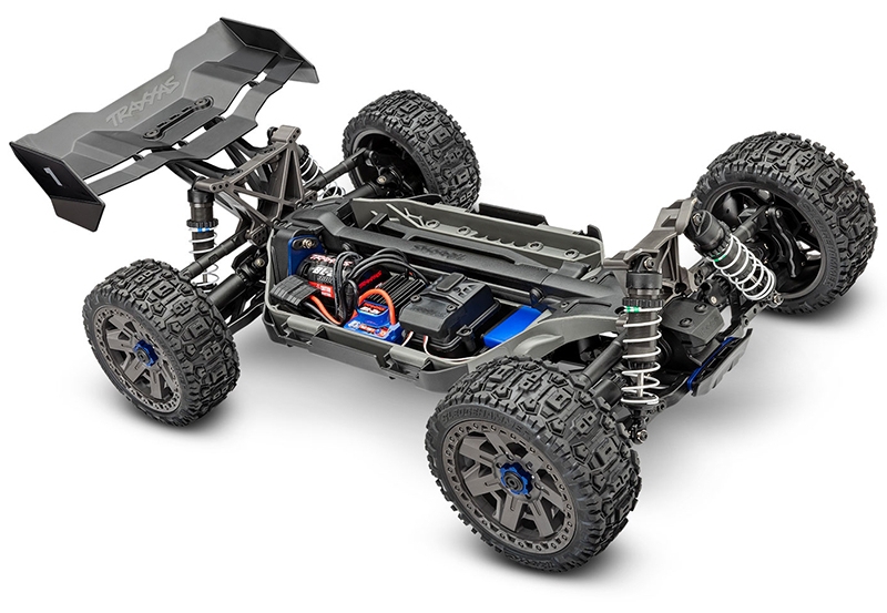 The composite tub chassis of the Traxxas TRX90154-4-RED 1/8 scale RC car is designed to concentrate mass below the driveshafts, enhancing stability and responsiveness. A T-Bar stiffener reinforces the structure, reducing flex under load and improving cornering precision. The modular layout allows easy access to electronics and drivetrain components, while the secure battery hold-down latch keeps power packs firmly in place during aggressive maneuvers. High-clearance skid plates protect the underside from debris and impacts, making the chassis suitable for off-road racing and trail exploration. This low-CG design contributes to the buggy’s race-inspired handling, allowing quick turn-in and flat cornering even at high speeds.
