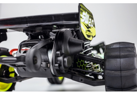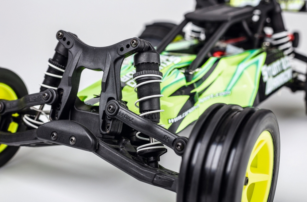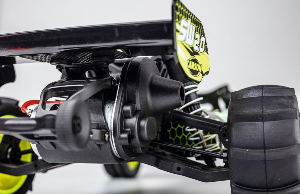 The CARSON C404206 2WD electric buggy with 2.4GHz radio system is built to handle uneven surfaces with confidence. Its 2WD drivetrain offers a lightweight configuration that enhances agility and acceleration, especially on compact trails and open terrain. The differential gear system ensures that power is distributed evenly between the rear wheels, allowing for smoother cornering and improved traction. Combined with the oil-filled shock absorbers, this setup absorbs bumps and jumps effectively, maintaining stability and control even during high-speed manoeuvres. The 2.4GHz radio system provides responsive steering and throttle input, with no interference from other RC vehicles in the area.
