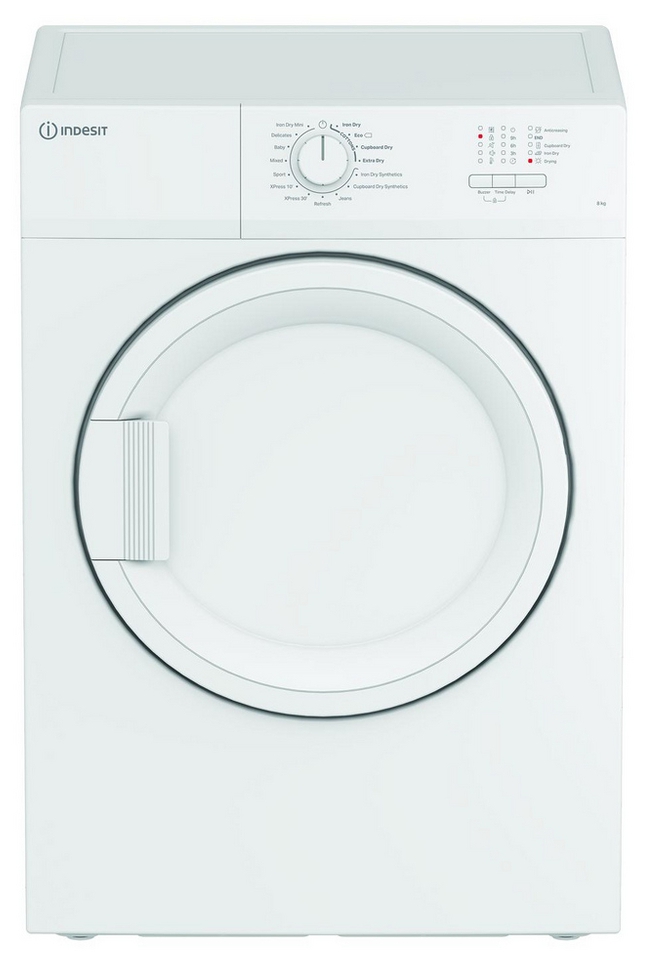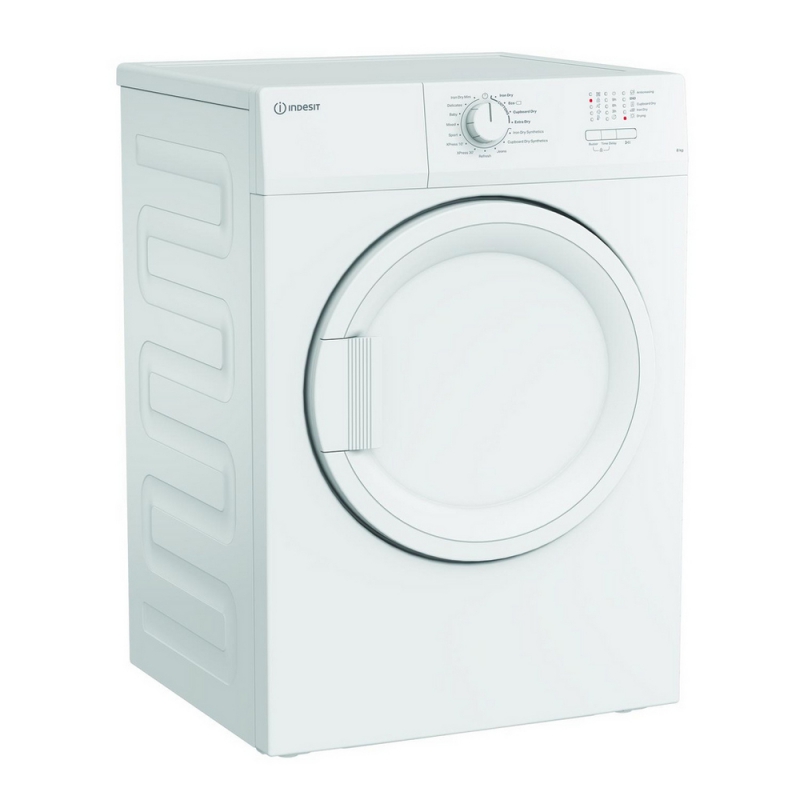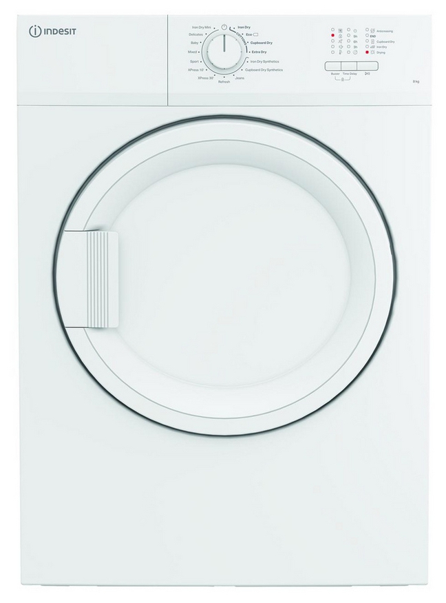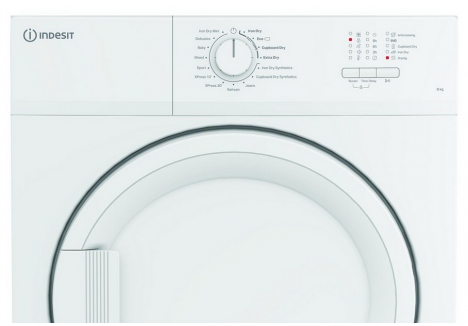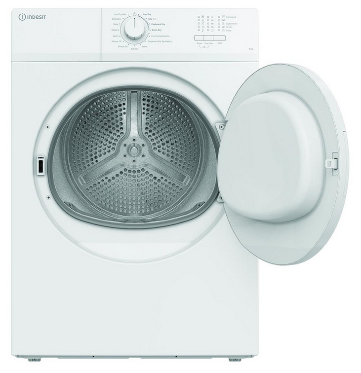 This Indesit 8kg vented tumble dryer white features a powerful air-vented system with an energy-efficient 2400W motor. The large 8kg vented tumble dryer drum holds up to 106 litres, enabling you to dry a full load of laundry with ease. Choose from four adjustable dryness levels to suit your fabric type, from Iron Dry to Extra Dry, while a timed drying system lets you set cycles from 10 to 155 minutes, giving you precise control.