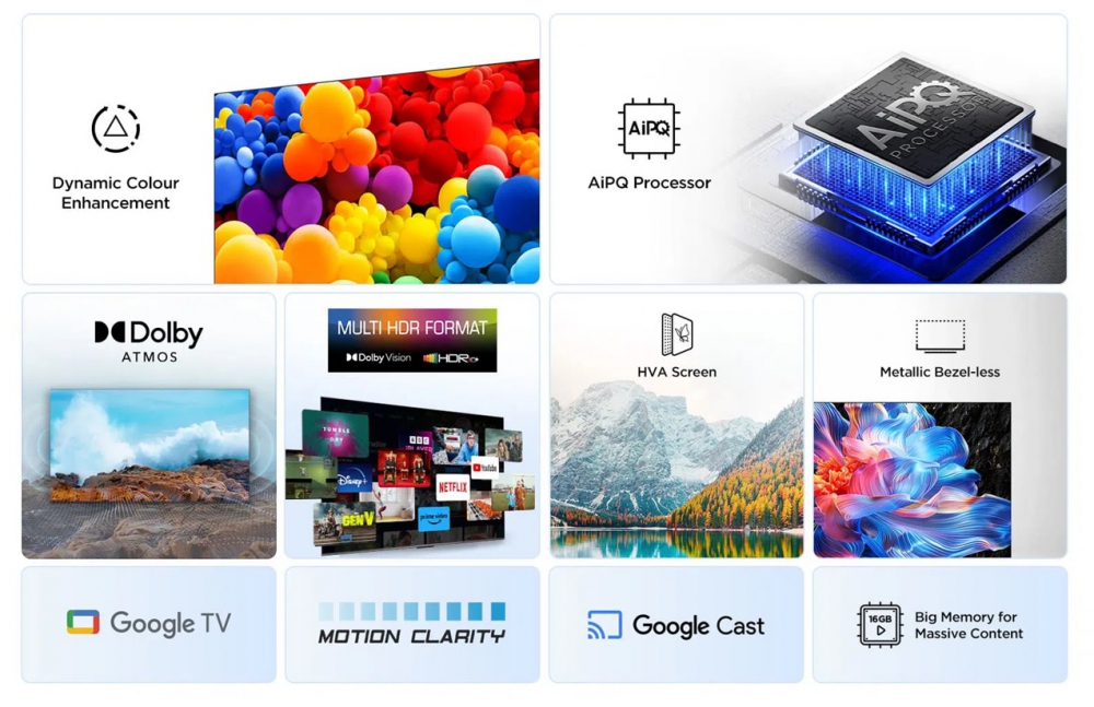 The TCL 75V6C-UK Smart TV Powered by Google TV features the AiPQ processor, which intelligently analyses content to optimise colour, contrast, and clarity. This processor adjusts settings in real time based on scene composition, ensuring that each frame is rendered with precision. Whether you're watching HDR content or standard definition broadcasts, the AiPQ engine enhances visual fidelity and reduces noise. Combined with multi-HDR format support—including HDR 10+, Dolby Vision, and HLG—the TV delivers lifelike images across all content types.